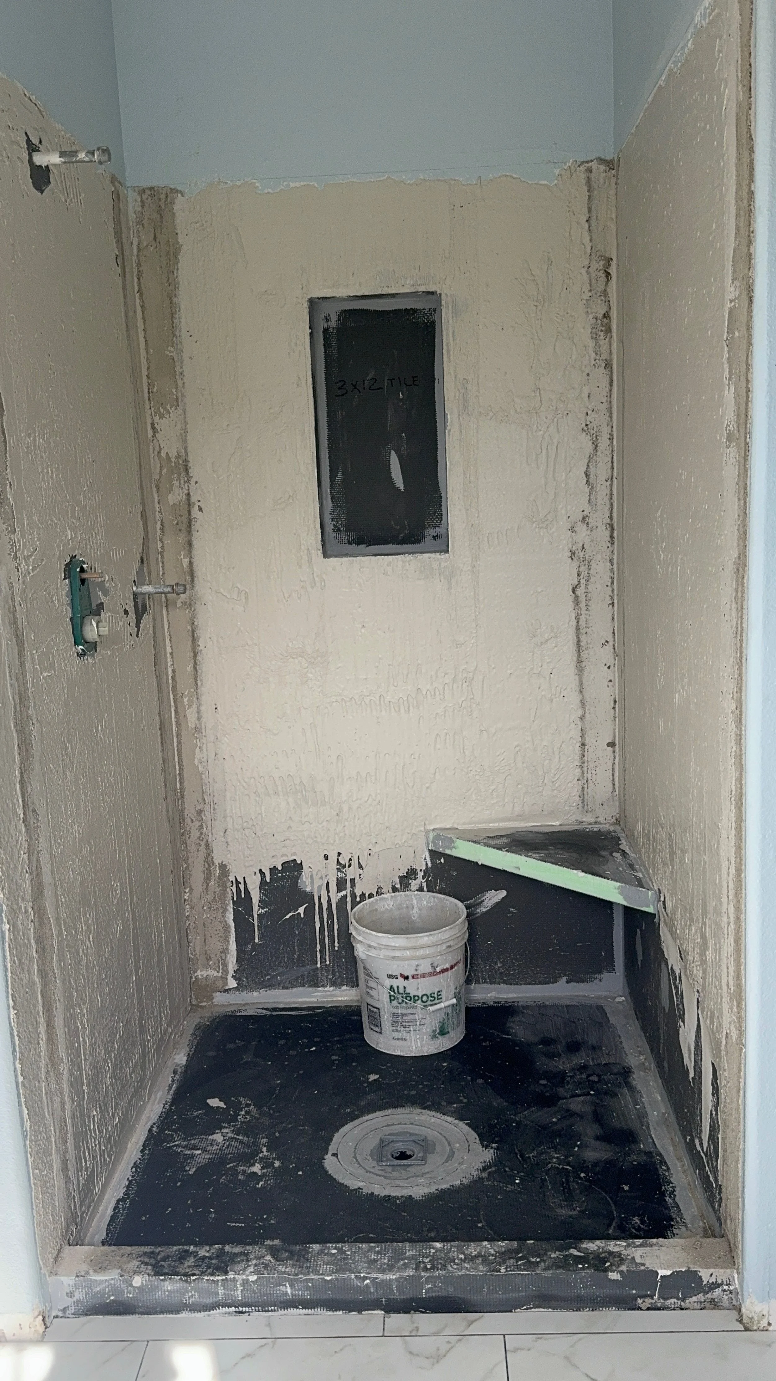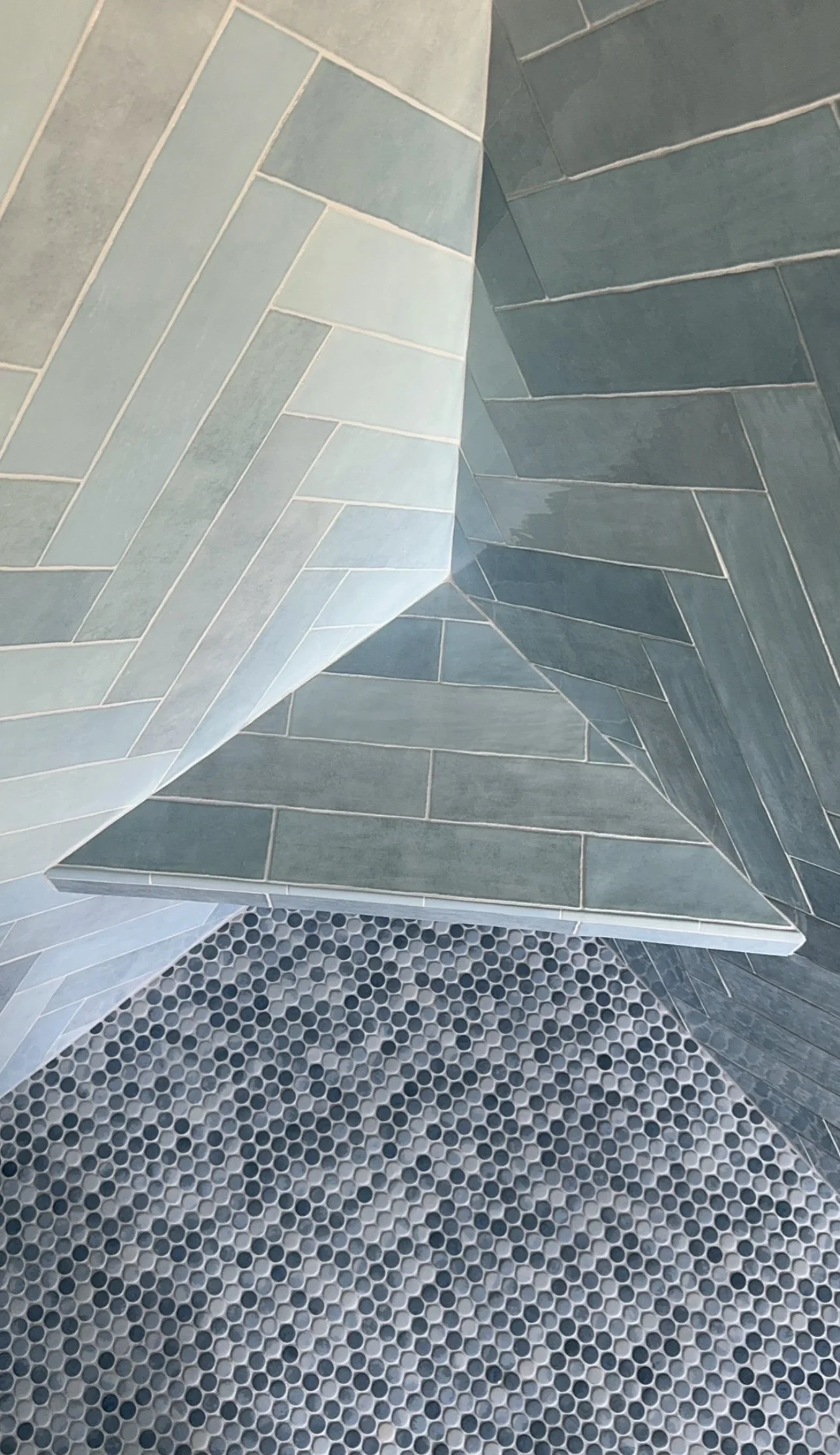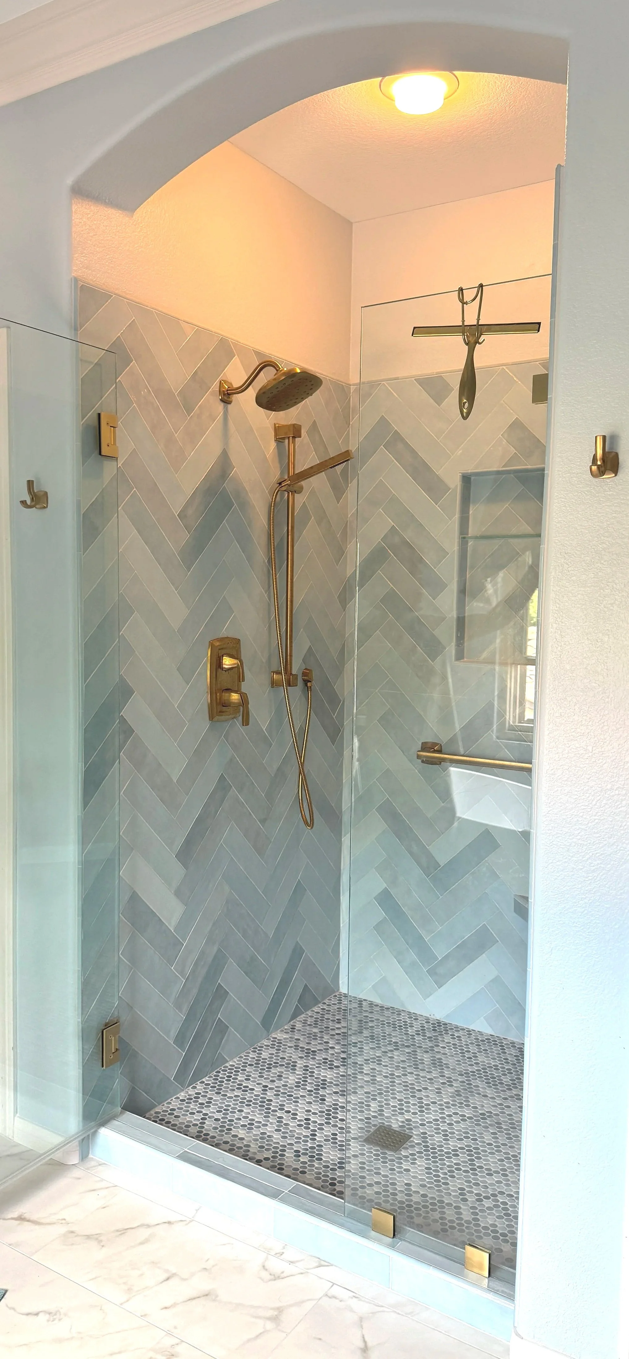 A serene escape featuring blue herringbone tile, brushed gold fixtures, and a glass enclosure framed by an arched entry blending coastal charm with modern luxury.